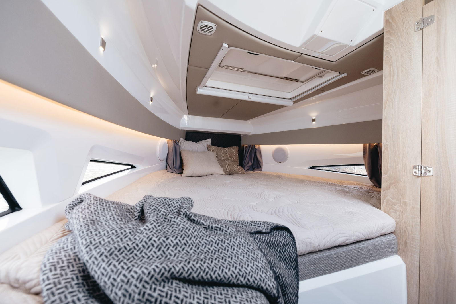 Kabinen i Noblesse 830 kommer att ge dig känslan av gott om plats, hög komfort och smarta lösningar för problemfria resor till sjöss. Här hittar du gott om förvaringsutrymmen och bra sängar. Hytten är utrustad med en stor dubbelsäng, en stuga med två (2) bäddar och ett separat toalettrum.
